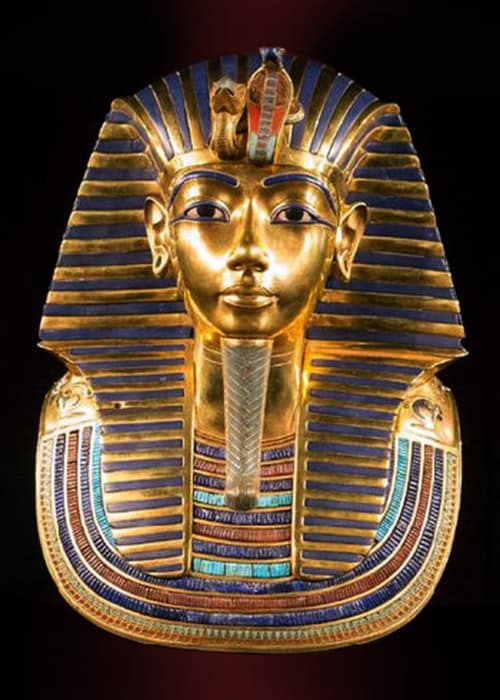 Zlatá pohrebná maska faraóna Tutanchamóna zdobená Lapisom lazuli (ultramarín) a farebným sklom, New Kingdom 18. dynastie (cca 1323 p.n.l.), Egyptské múzeum v Káhire. Výška 53,3 cm.